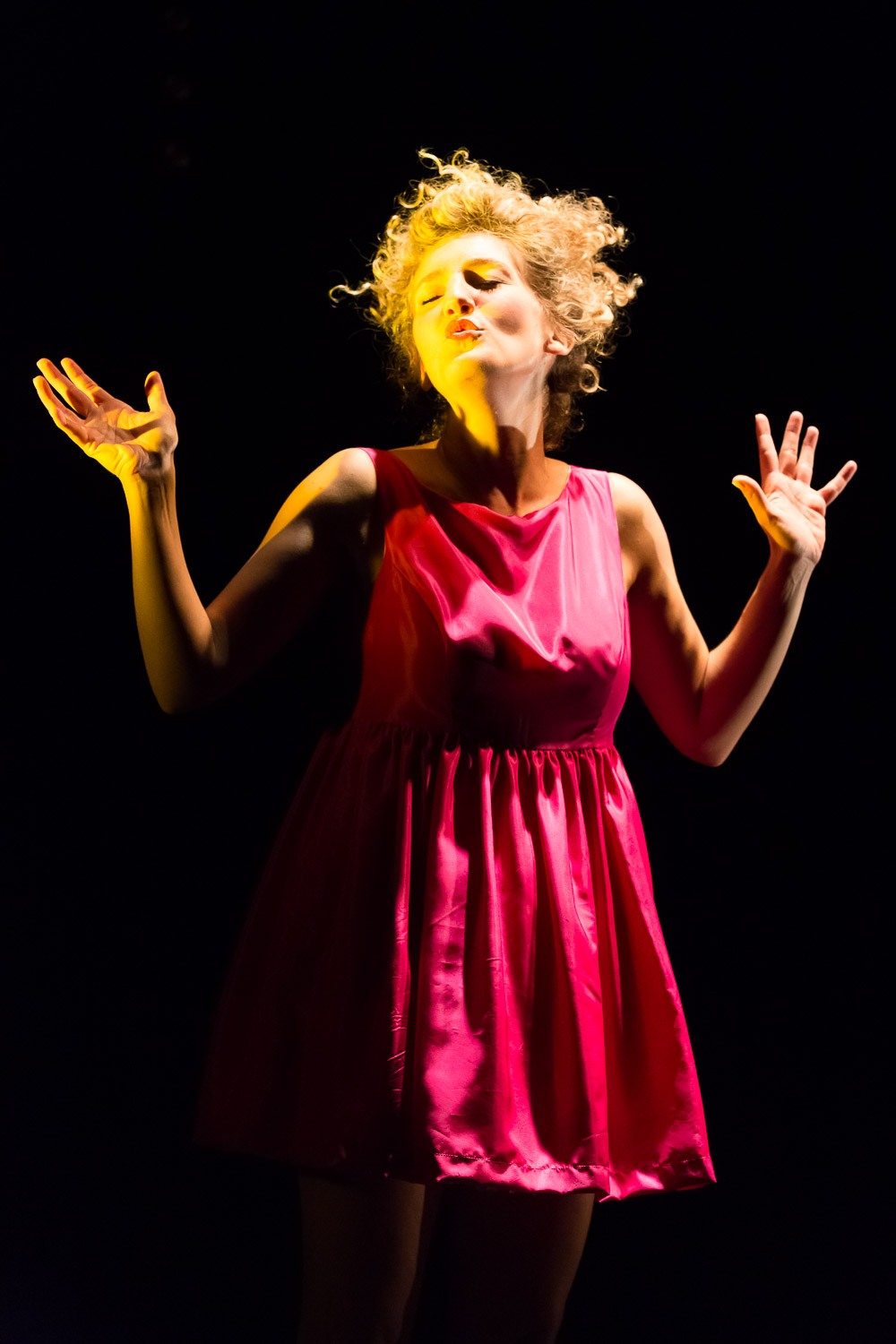 Le jeu, virer les tics, accentuer ici, travailler le chant, sur le texte aussi, nous avons revu des choses, le temps, le rythme, les fantaisies. Elle est formidable Kim Schwarck. Elle raconte une histoire forte, importante, vraie, bouleversante. Sa vie, aujourd’hui, elle a trente ans. Des parents connus mais pas trop, un peu. Une mère chanteuse, un père acteur, et le plaisir de vivre, du sucre et du sel. Les recettes des grand-mères, la bouffe, la vraie, la nourriture, comme joie de la vie, comme fête de l’existence, depuis l’enfance. Elle dit tout de ses références et de son bonheur d’être au monde, grâce aux plats, aux repas, aux goûts, aux saveurs, aux desserts, puis elle cherche à comprendre pourquoi, comment, de quelle manière c’est arrivé.