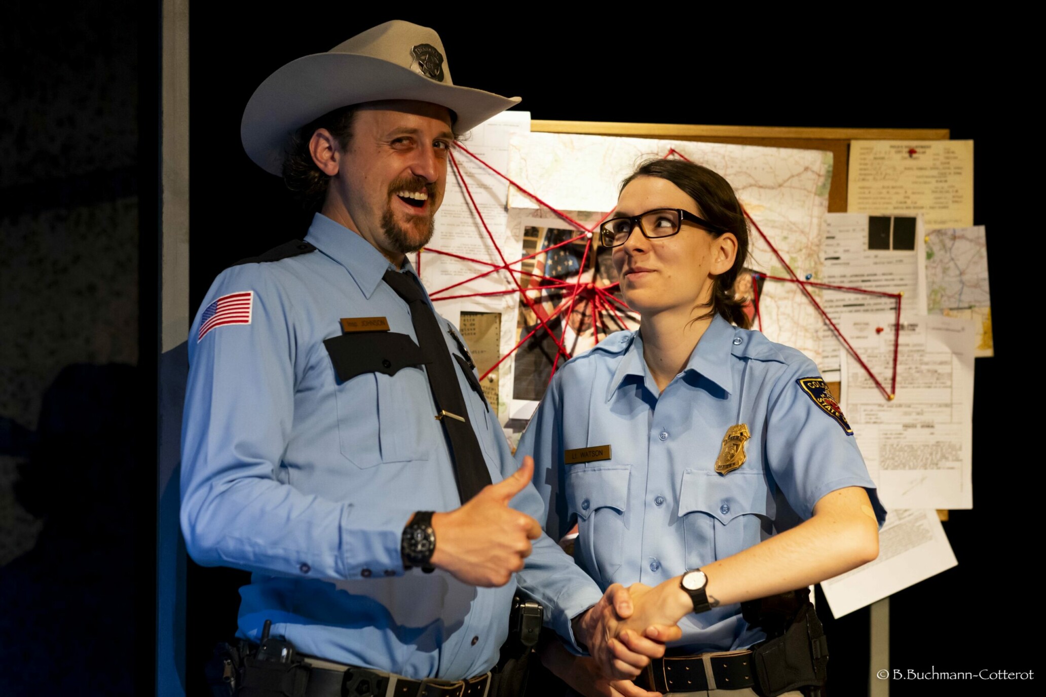 Une histoire, deux policiers baroques et trois scénarios où pleuvent jeux de mots, bafouillages sémantiques, clins d’œil à la pop culture française des années 1970-1980, dialogues absurdes, gestuelles et gesticulations dignes de John Cleese. Le décor est sobre, malin et efficace, la mise en scène très bien réglée. On pense à Ionesco et aux Exercices de style de Queneau. Bref, on est au Théâtre des Béliers, où la programmation est toujours invariablement réussie.