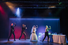 Belle histoire d’un clown inadapté et manipulé qui finira par imploser. Du début à la fin, Ivan Pralin laisse un sentiment de pitié de part sa vie vide et fade. Le patronat l’a placé à un poste qui finira par le détruire. On ne le plein pas, ce dernier n’est pas des plus érudit. Il est inconscient de son statut et de celui de ses employés. Les 4 comédien.nes sur scène délivré une prestation superbe. La mise en scène est efficace, inventive avec peu de décors. La première partie de la pièce nous embarque dans un routine bétonné ne laissant aucune place à l’humain pour laisser Pralin exploser en plein vol après s’être fait jeter. Manque de bol les débris arrive jusqu’au mariage d’un de ses employés. Entre discours déformé, rave party improvisé dans la salle des fêtes, Une Sale Histoire de Benjamin Brenière reprend avec brio le texte de Dostoïevski en le peignant avec les travers de la macronie et des luttes sociales actuelles.
